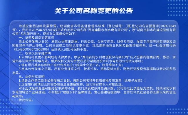 2022年9月,原湖南建工集團(tuán)與原湖南交水建集團(tuán)合并組建湖南建設(shè)投資集團(tuán)。原雙方集團(tuán)旗下的湖南百舸水利建設(shè)股份有限公司和湖南建工集團(tuán)水利水電工程公司合并為湖南建投百舸水利公司,實(shí)行兩塊牌子(百舸水利、建工水利)管理,為湖南建投集團(tuán)唯一水利建設(shè)企業(yè)。2024年9月,公司正式更名為湖南建投水利水電有限公司(簡(jiǎn)稱(chēng)湖南建投水利),統(tǒng)籌管理“百舸水利”“建工水利”“施工公司”“疏浚公司”等子品牌。